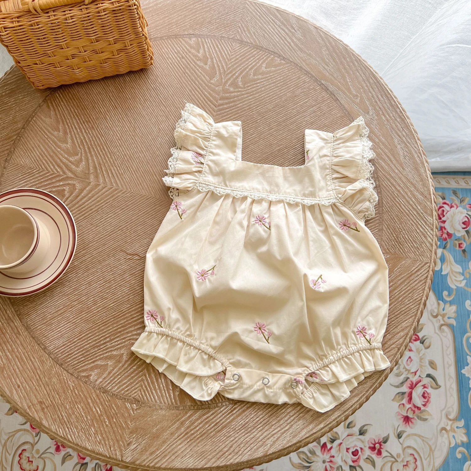 Entzückender Baby Einteiler aus Baumwolle mit Blumen und Rüschchen.