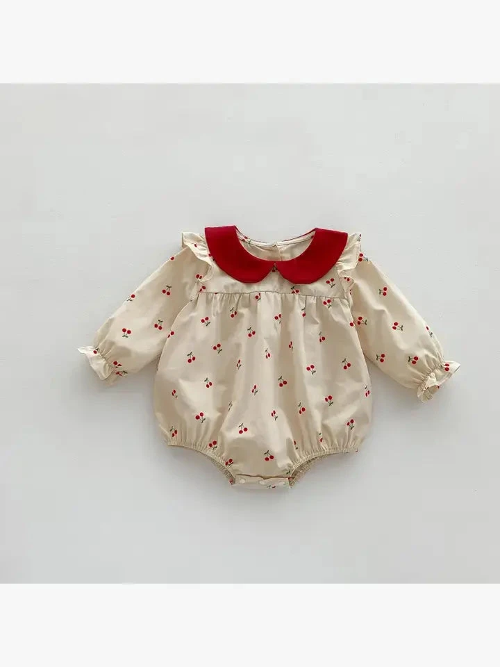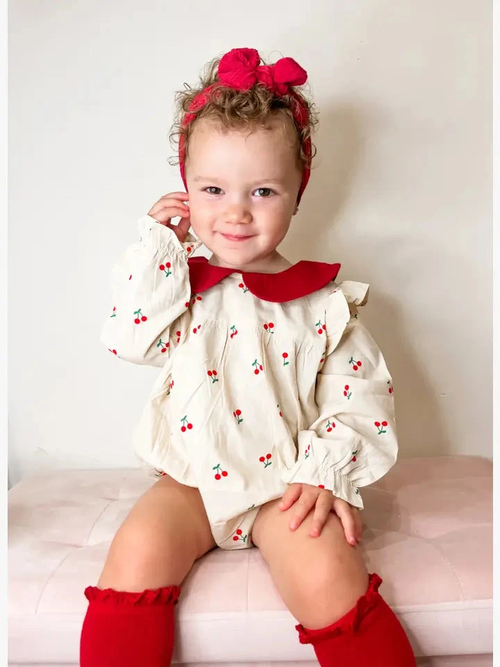 Süßer Baby Bloomer mit roten Bub-Kragen – passend dazu gibt es im Shop auch Haarband und Strümpfe.