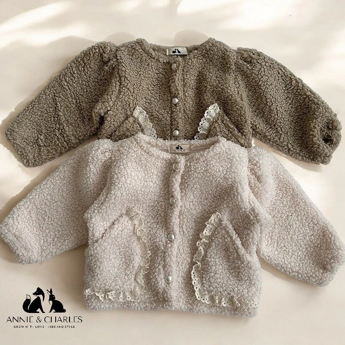 entzückende flauschige Jacke aus Baumwolle mit Perlen-Knöpfen und vorderen Taschen in zwei verschiedenen Farben.