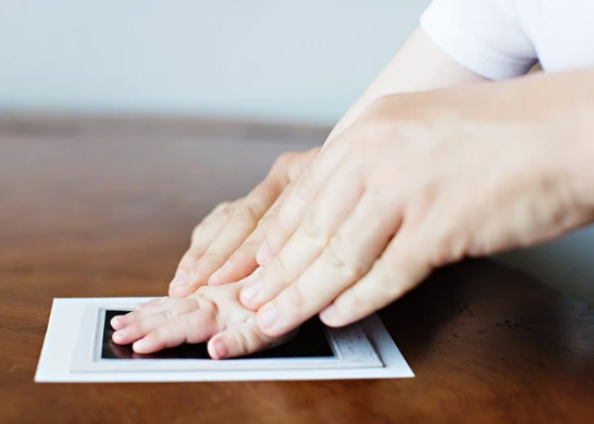 Die Hände und Füße des Babys bekommen nicht einmal ein bisschen Tinte ab. Deswegen ist es sehr sicher für Babys. Das Stempelkissen hat zwei Seiten. Legen Sie die Hand des Babys vorsichtig auf die saubere Seite und drücken Sie, dann erhalten Sie ein lebenslanges Andenken.