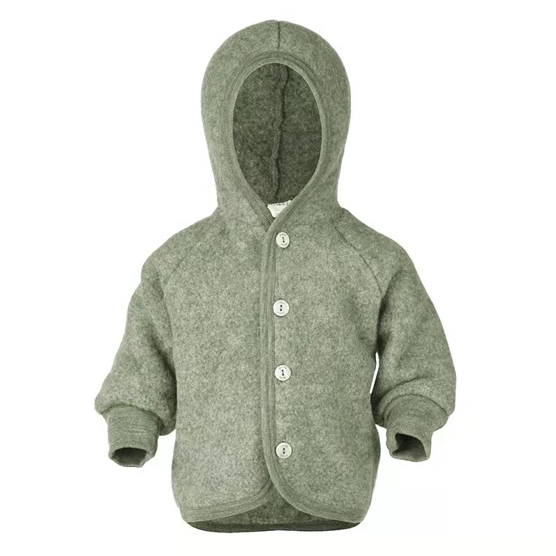 Stylische und warme Kinder Jacke für Ihren kleinen Zwerg aus warmen Woll-Fleece mit Kapuze und Holzknöpfen. Innen gefüttert ist die Jacke mit weicher Bio-Baumwolle! Perfekt für die kälteren Herbst- und Wintertage draußen.