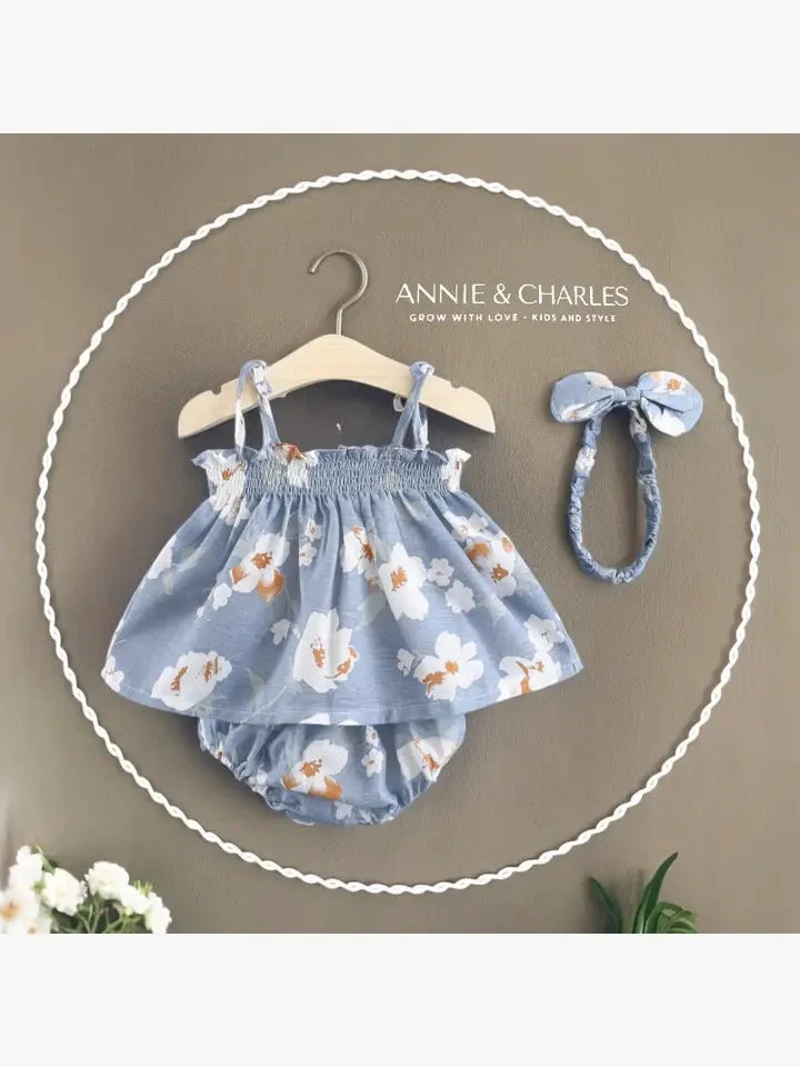Süßes Baby- und Kinder Set bestehend aus Kleid und Shorts mit blumigem Motiv und Stirnband. Praktisch, angenehm aus weichem Material und stylisch zu gleich!