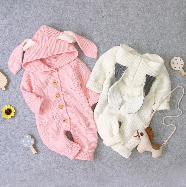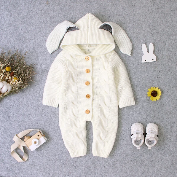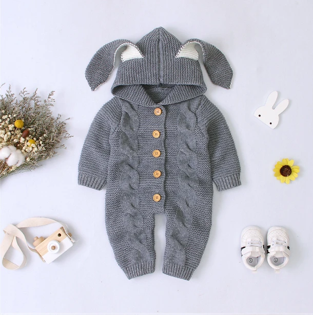 Super süßer und weicher Strick-Jumpsuit mit Kapuze und Hasenohren in verschiedenen Farben und Größen erhältlich.